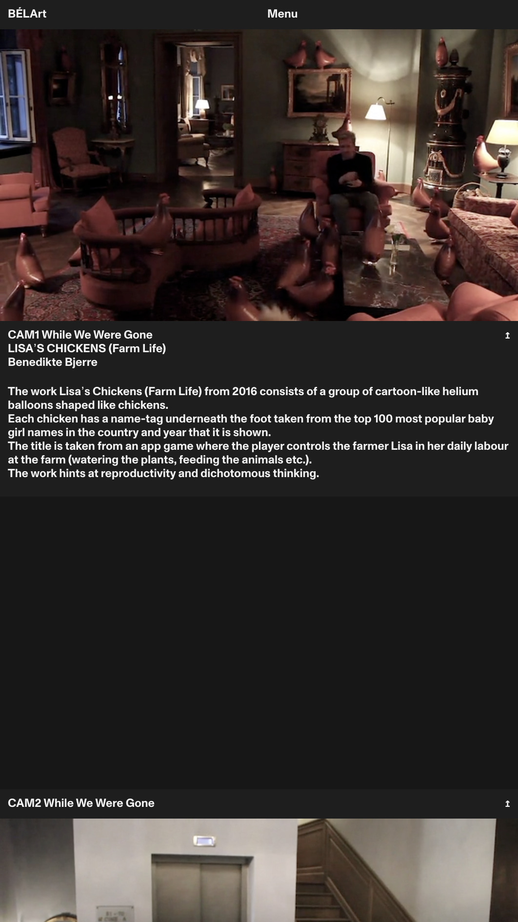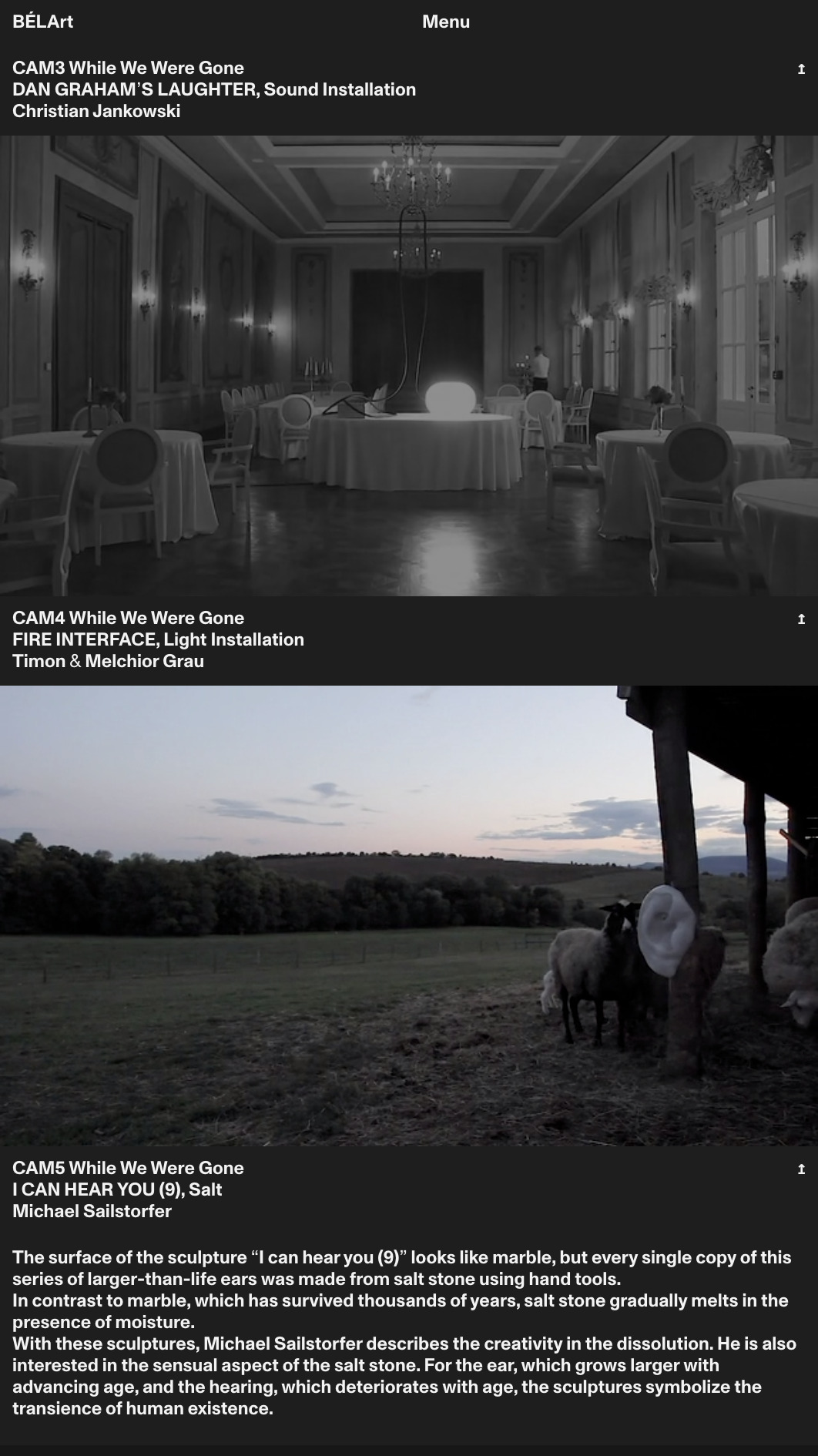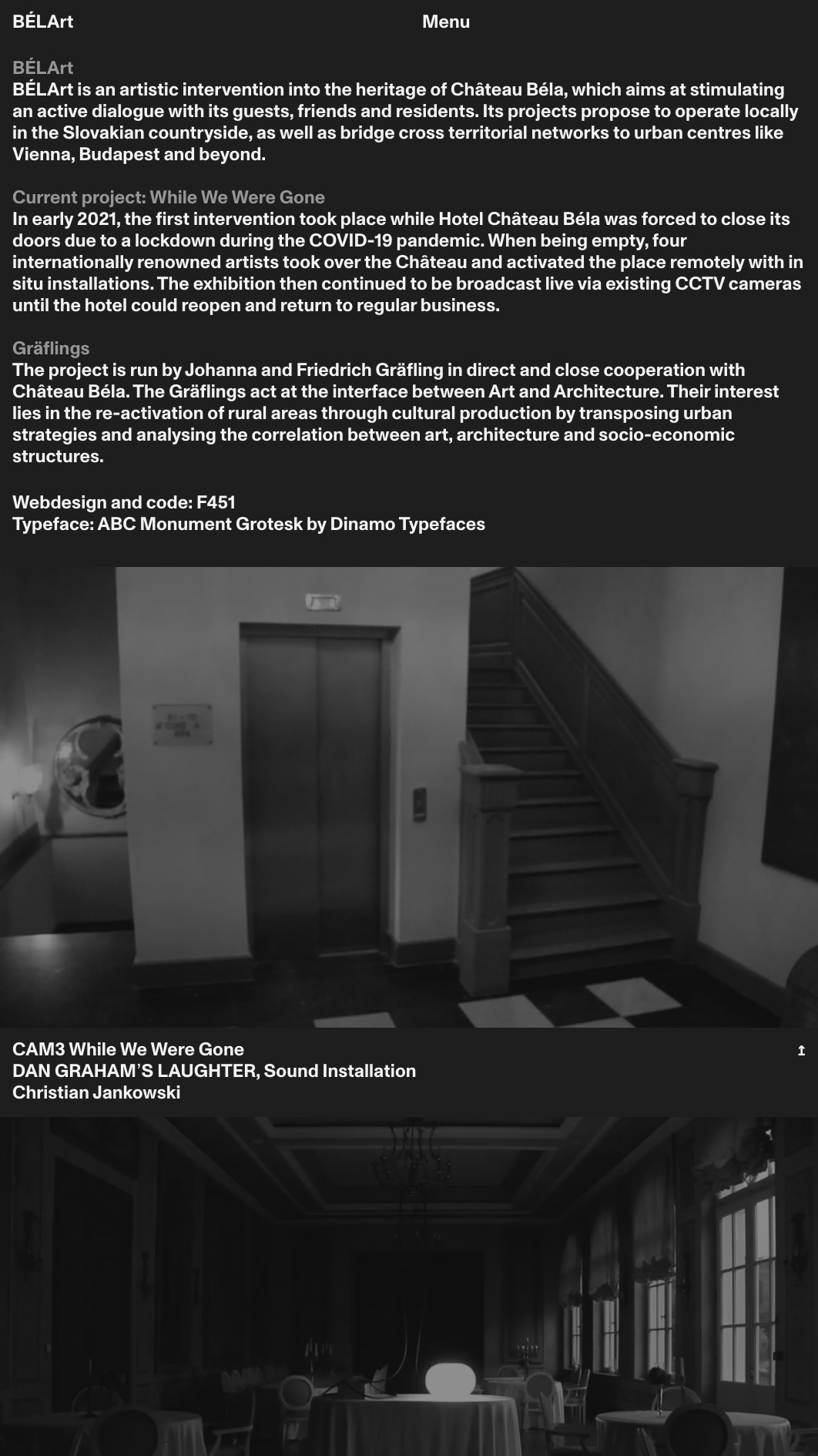 An online exhibition website structured as a video surveillance monitor for the art installation While We Were Gone. Due to the pandemic-induced closure, Château Béla used hotel CCTV cameras to capture the artworks and make them accessible online until it could reopen.