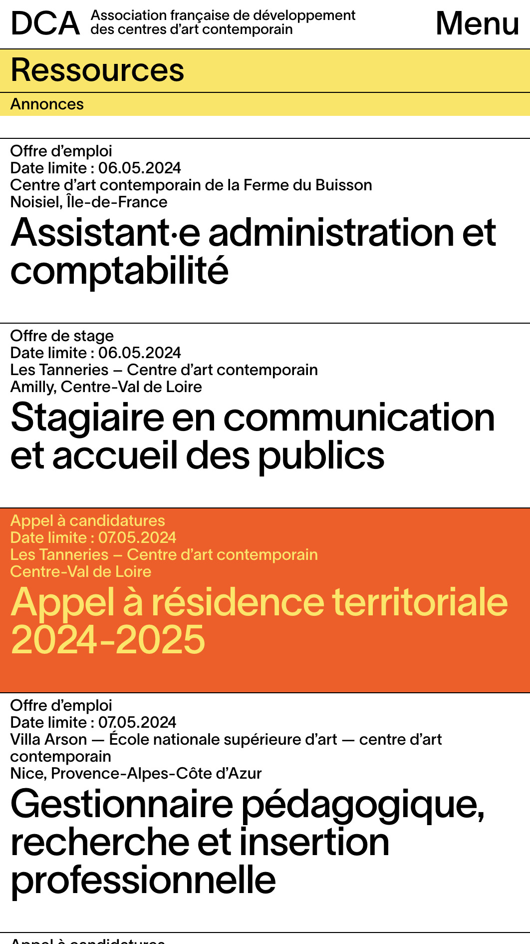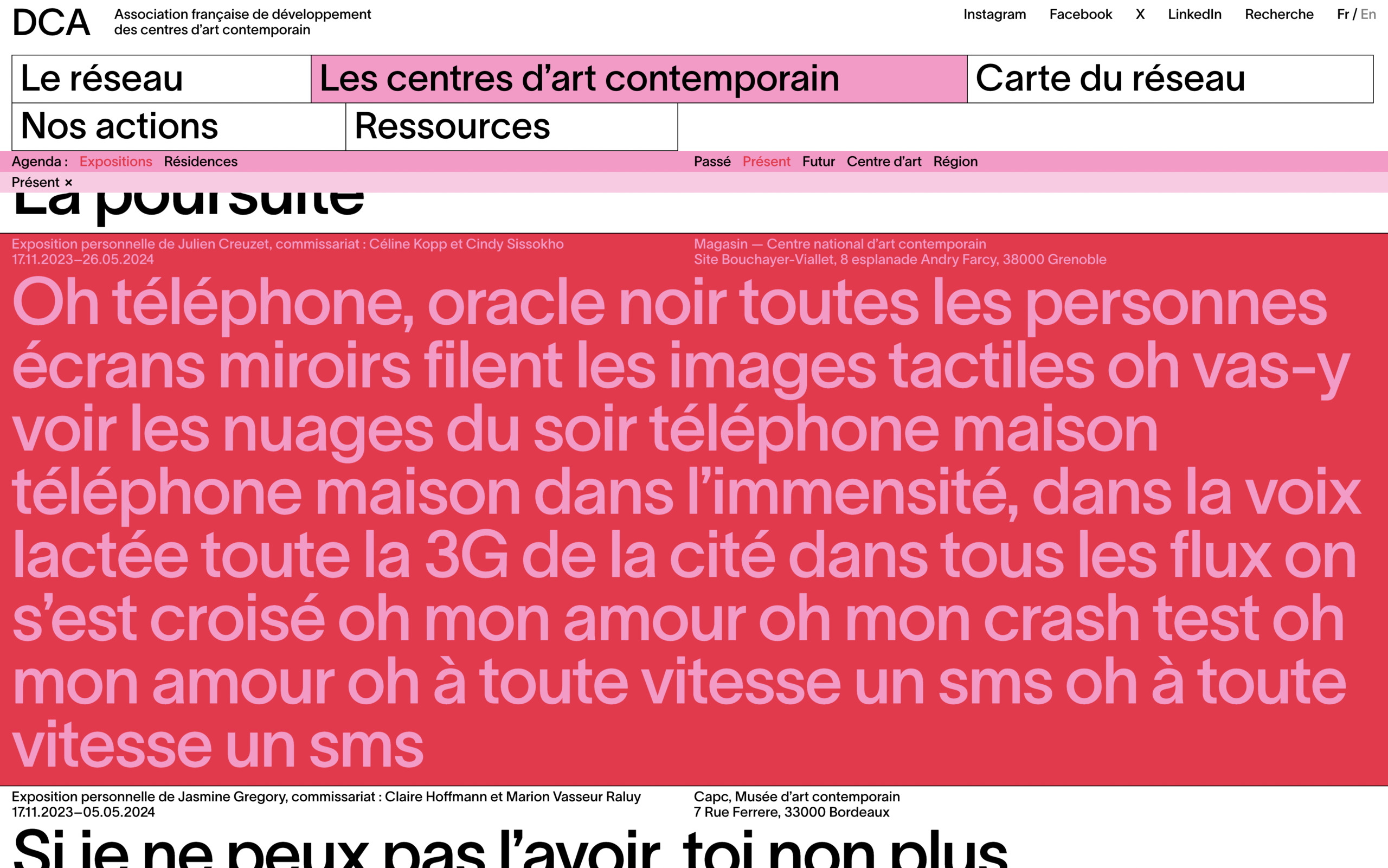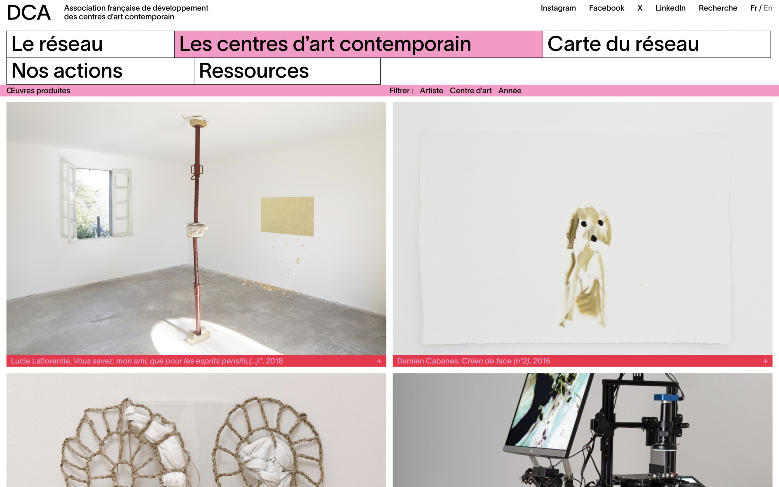A colorful new website for DCA, the French Association for the Development of Contemporary Art Centers. This content-rich platform serves as the national network uniting 54 contemporary art centers across France.