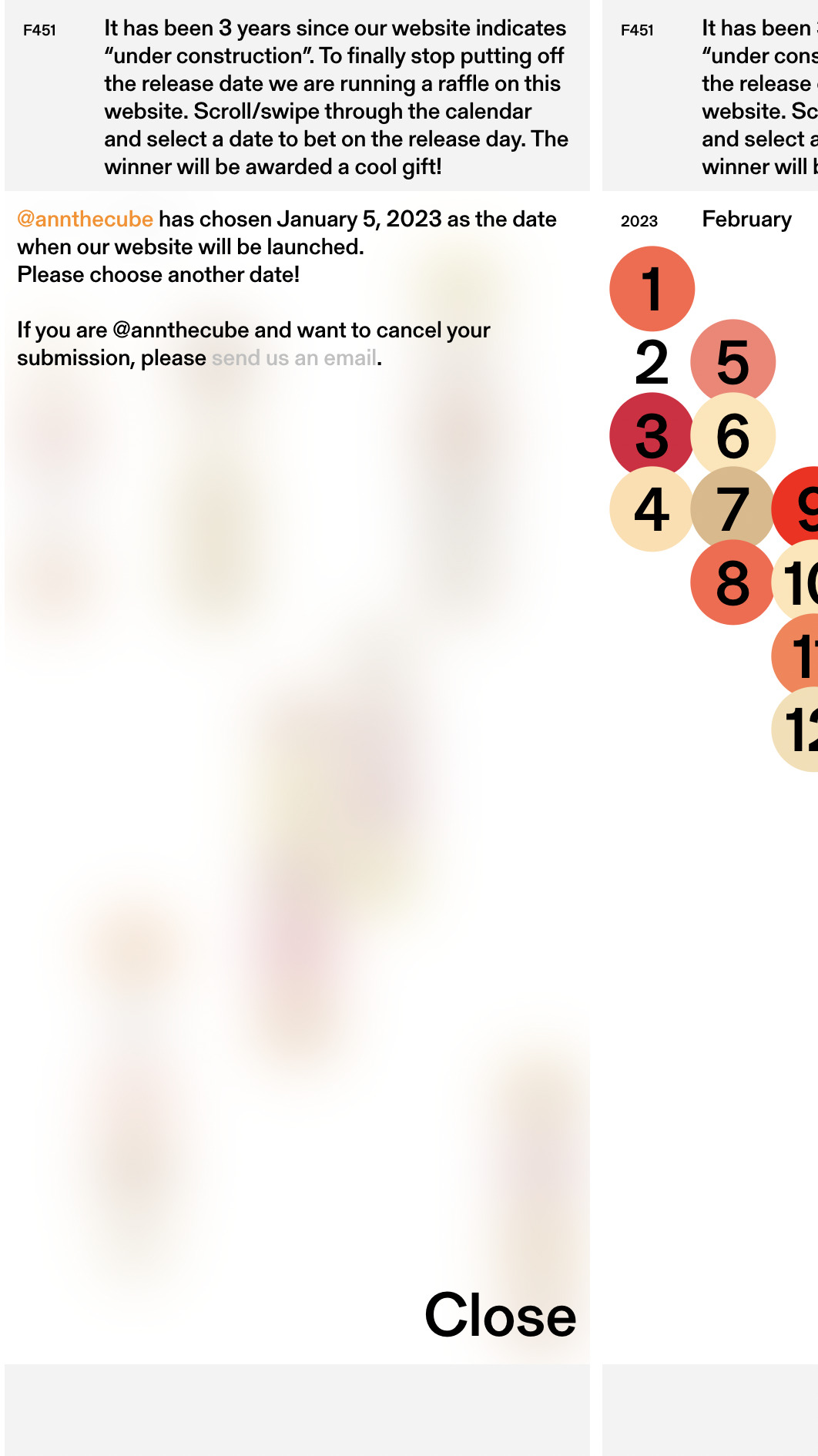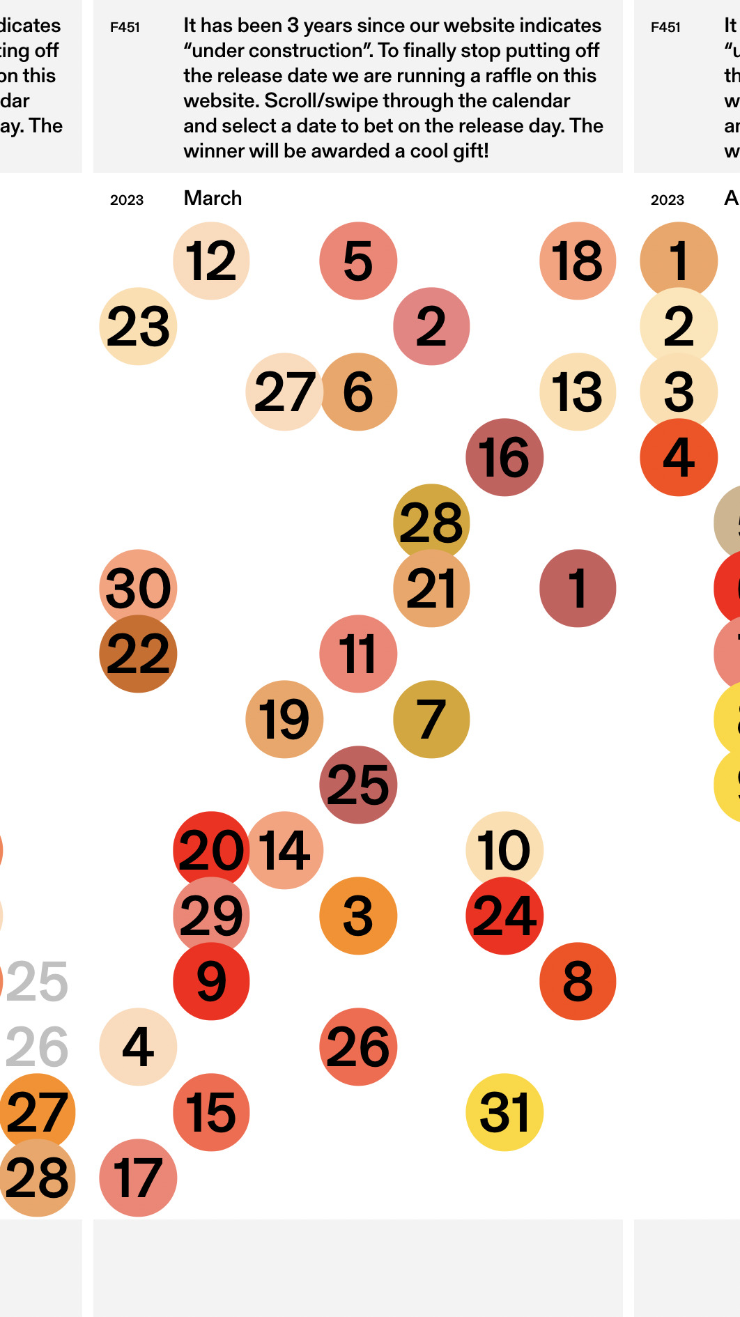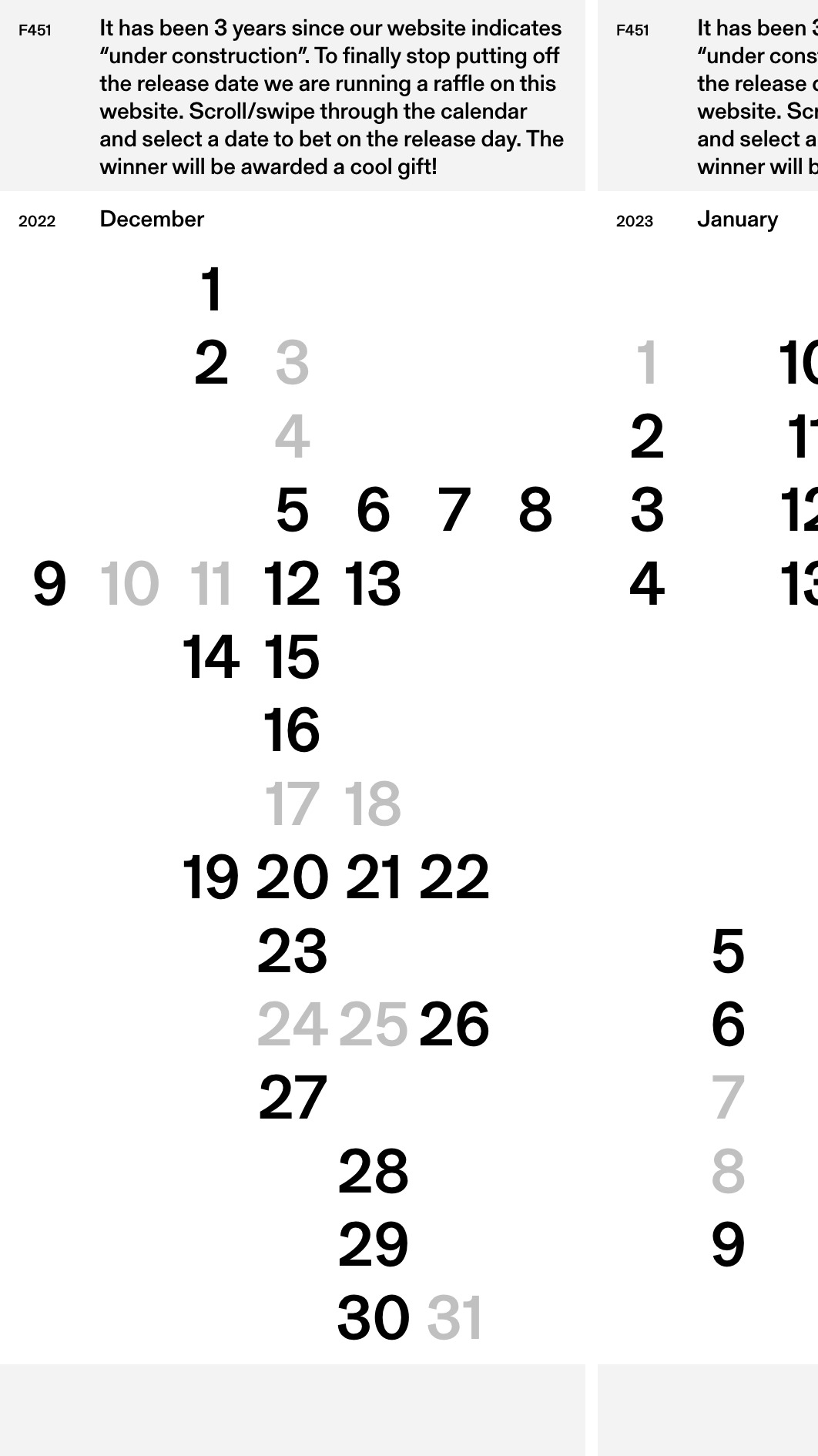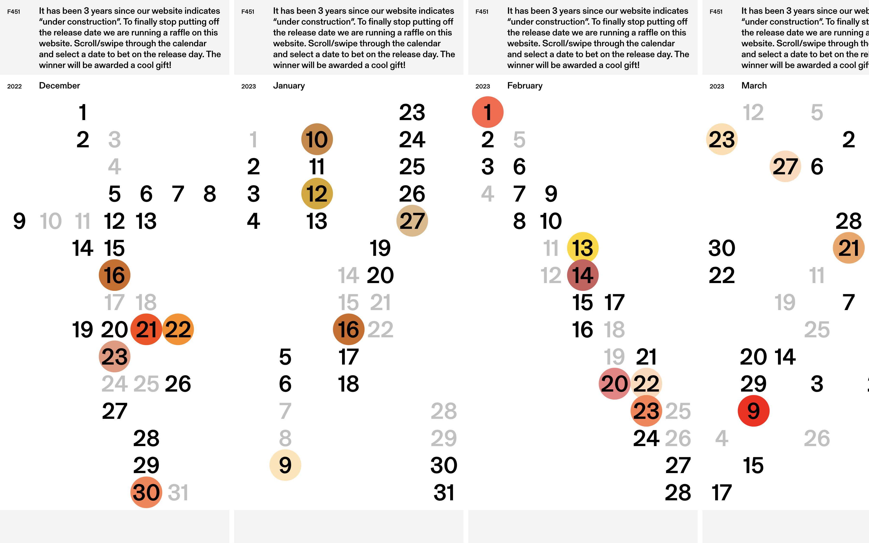 A temporary webpage designed as an online raffle to prompt the release of F451’s website. Friends and visitors were invited to place bets on the website’s official launch date.