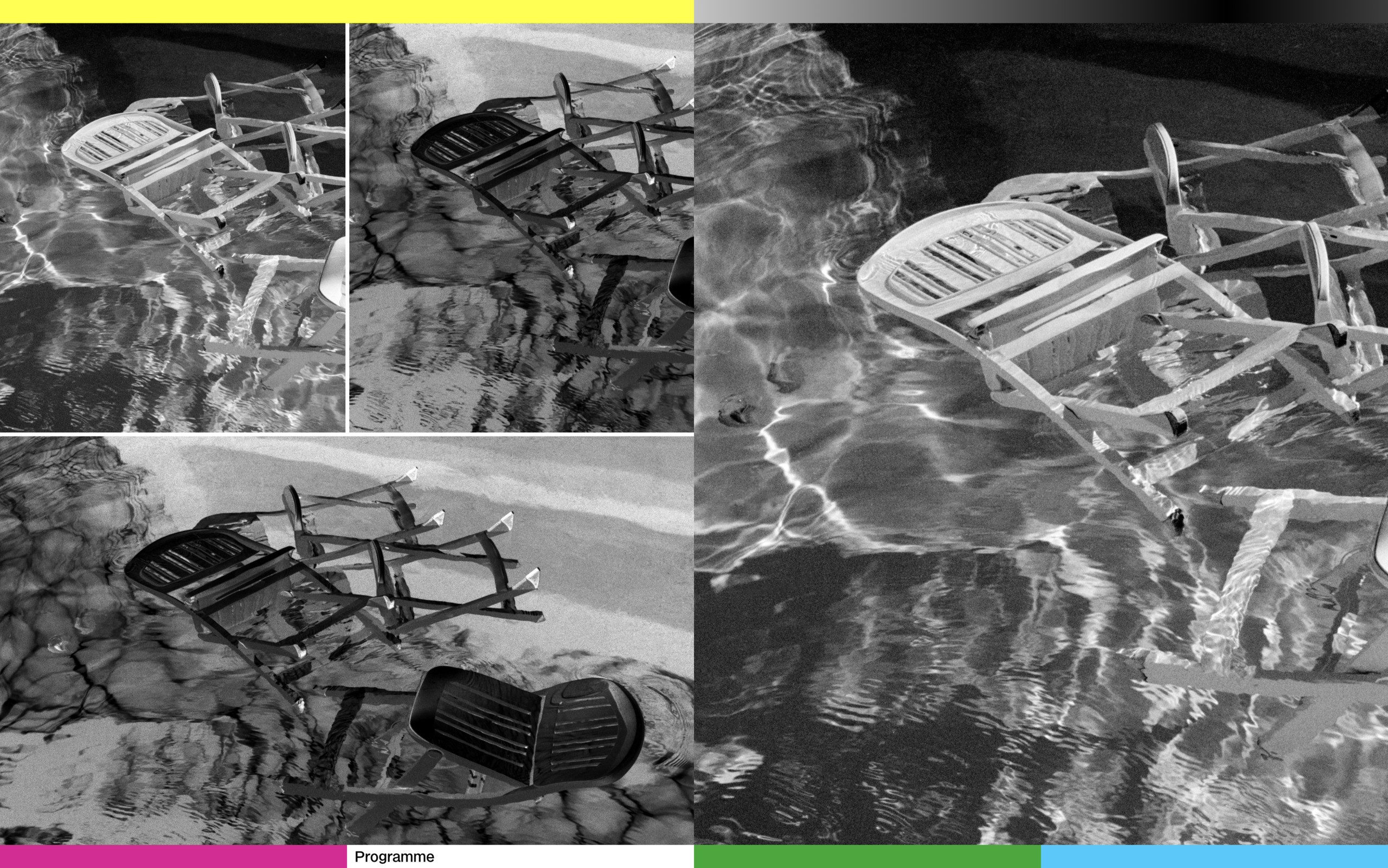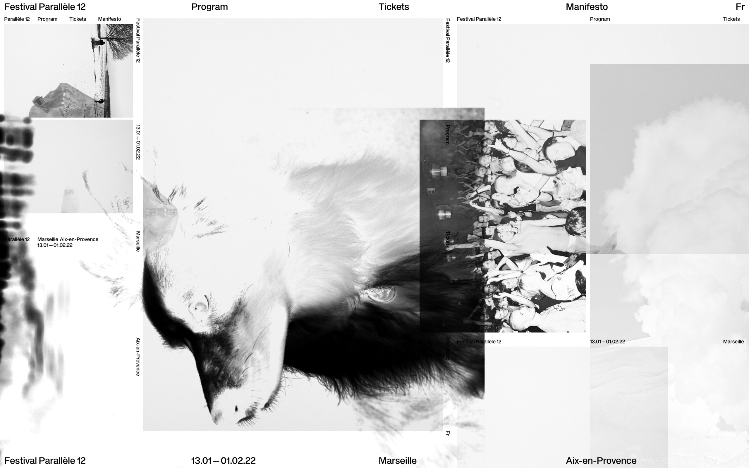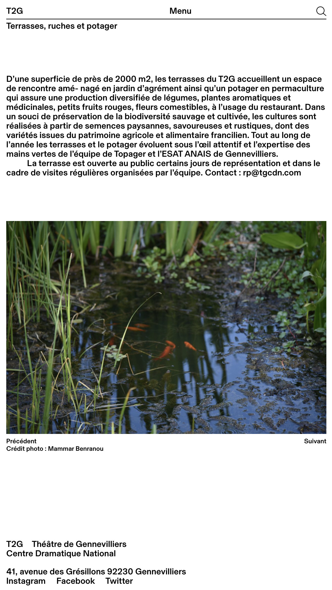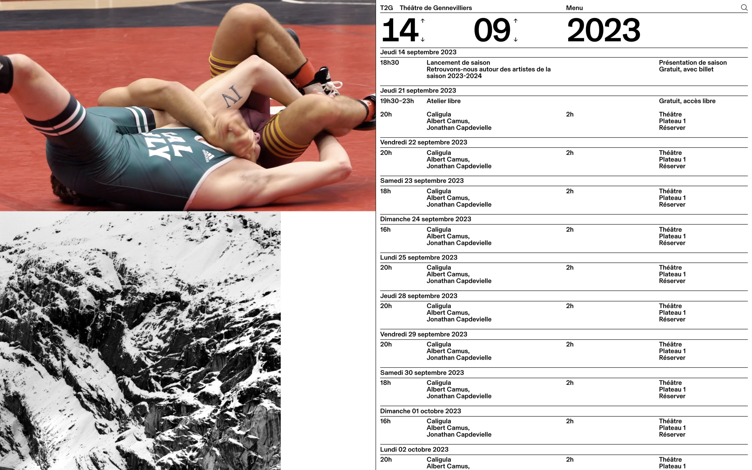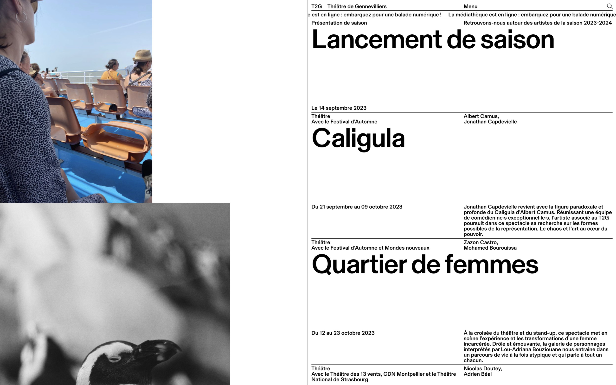 A new website for the Théâtre de Gennevilliers (T2G), a French national dramatic center. The website is divided into a split screen of image series and informative texts.