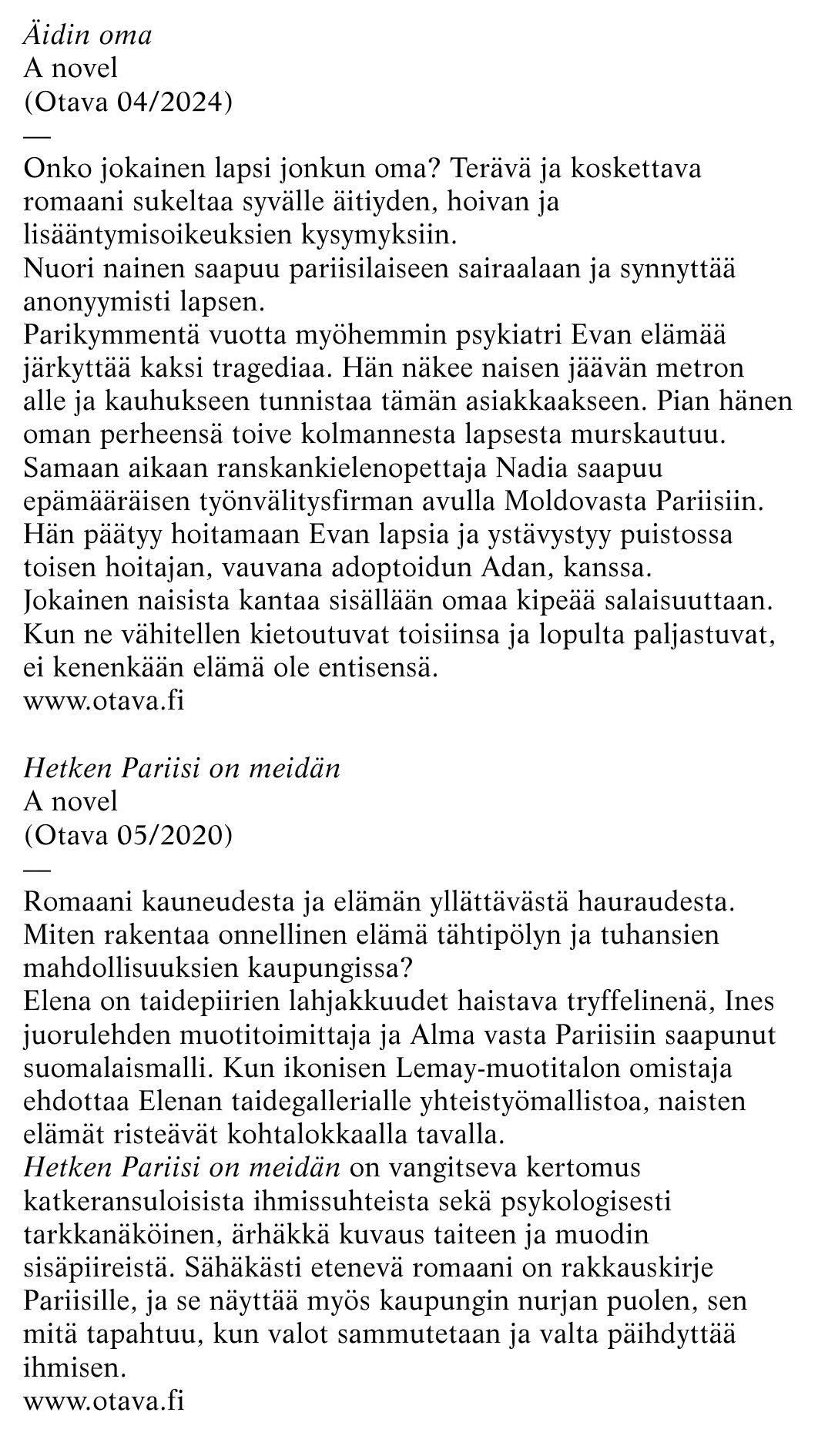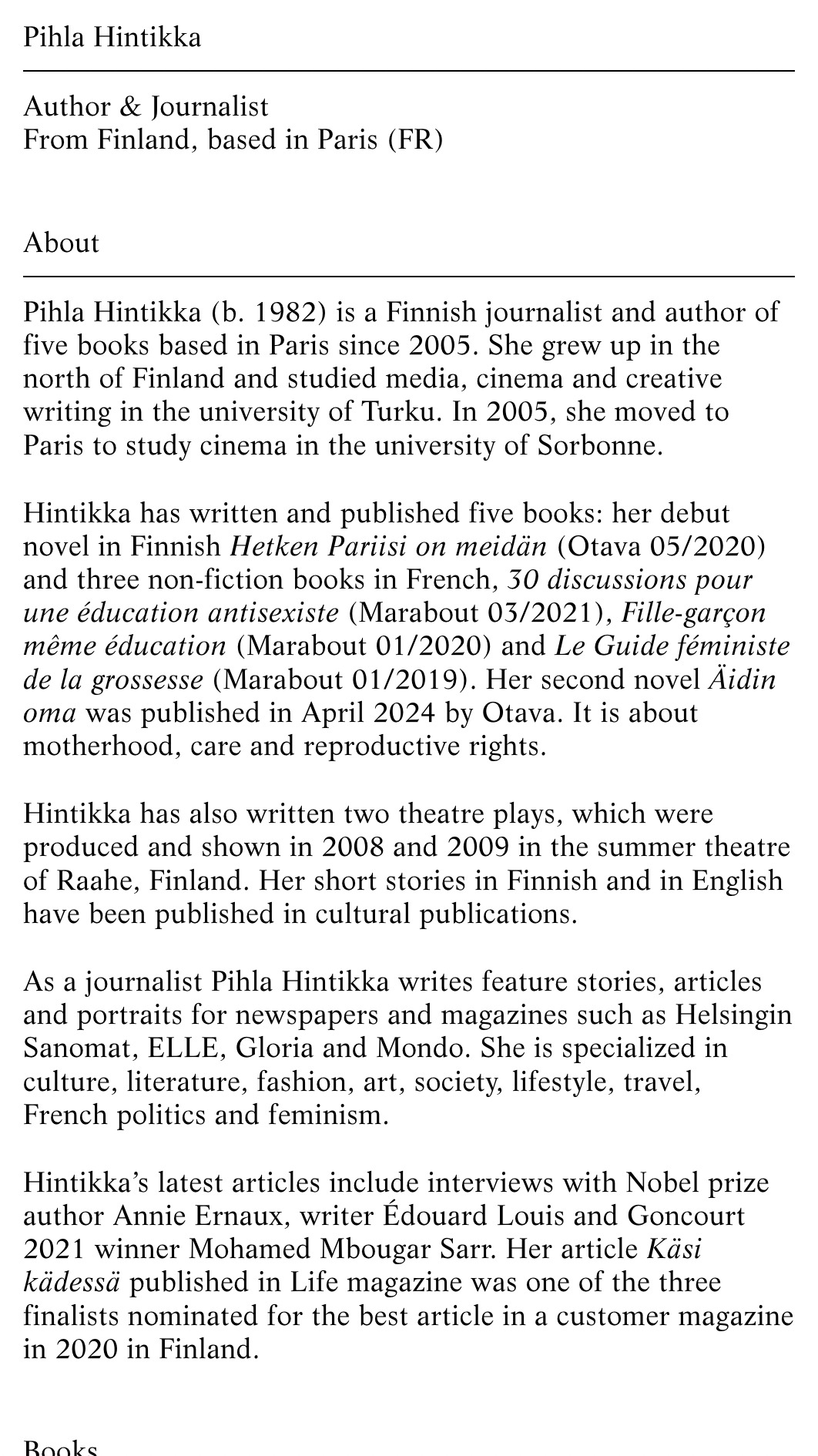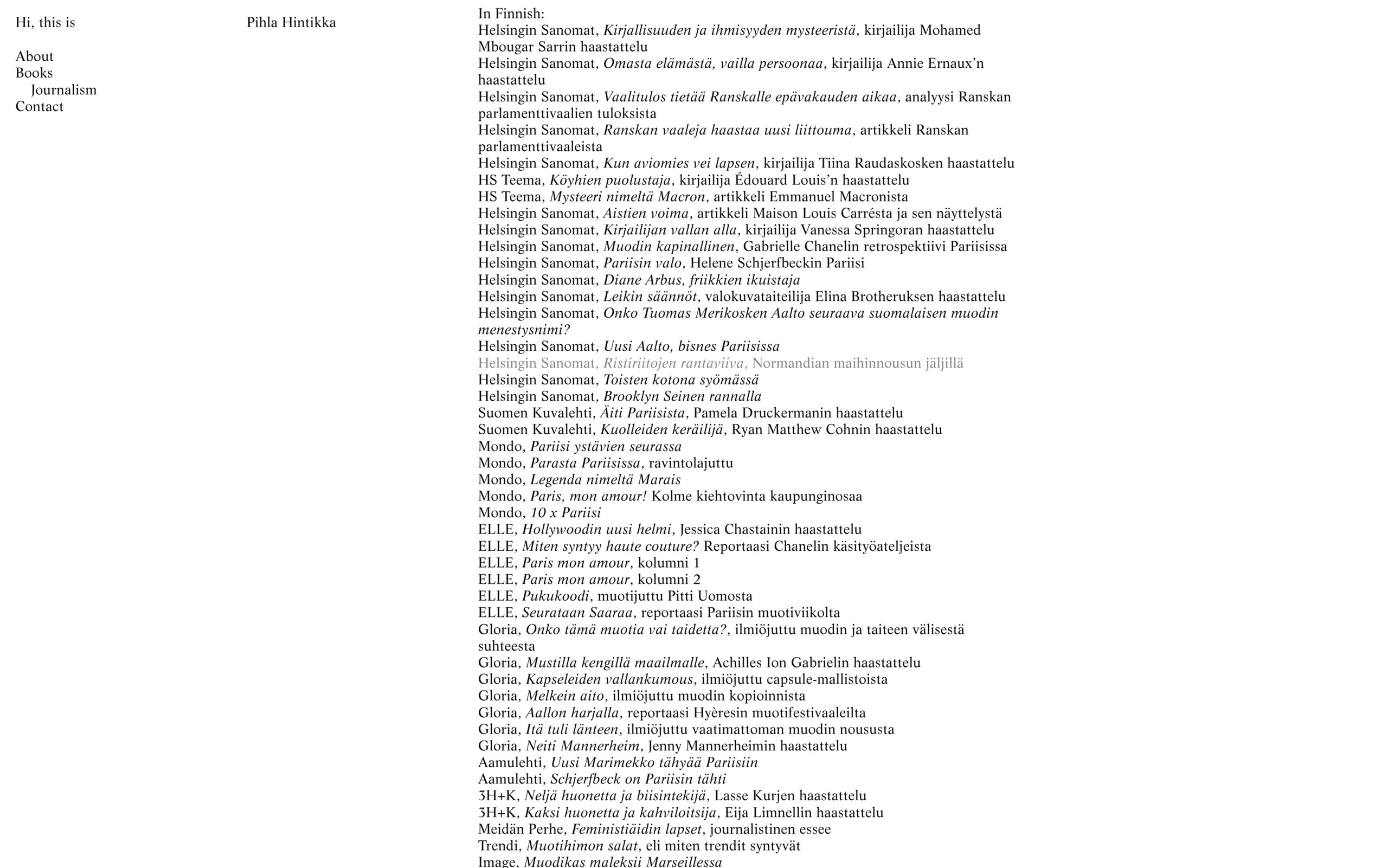 An index for Finnish journalist and author Pihla Hintikka. The webpage lists books, articles, and projects organised by category.