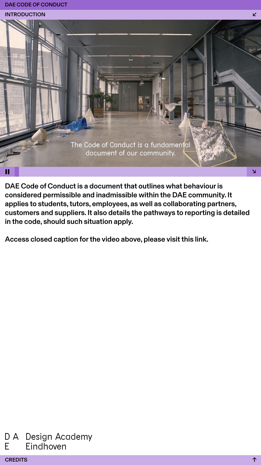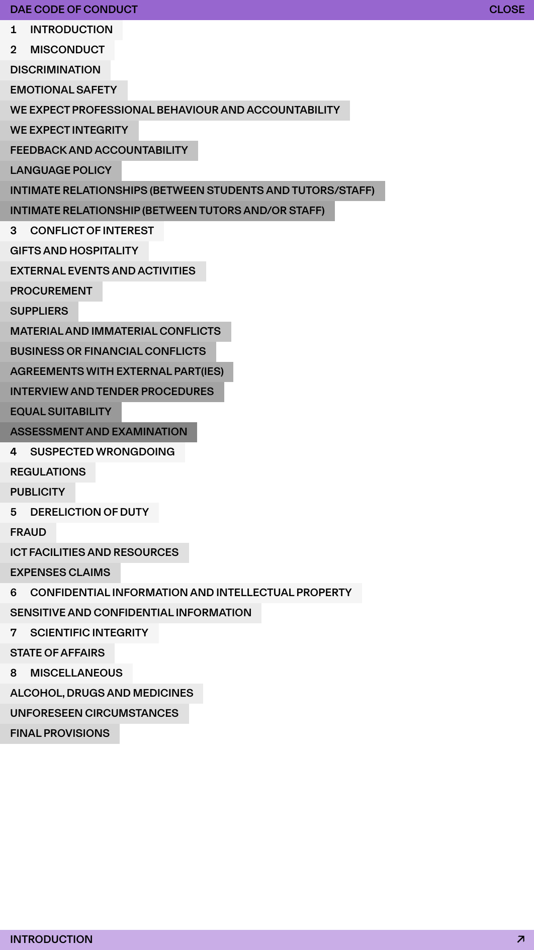 An interactive code of conduct for the Design Academy Eindhoven. The website acts as a handbook for the school community, augmented with definitions, chapter navigation, and an interactive list of common keywords.