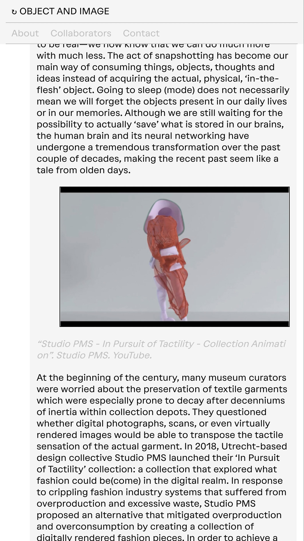 An online publishing platform for collaborative and speculative essays on the design discipline, preservation, and representation in museums as of 2020. Inspired by grassroots publishing and platforms such as Google Docs or Etherpad, Object and Image seeks a balance between spontaneous collaborative writing and online publishing.