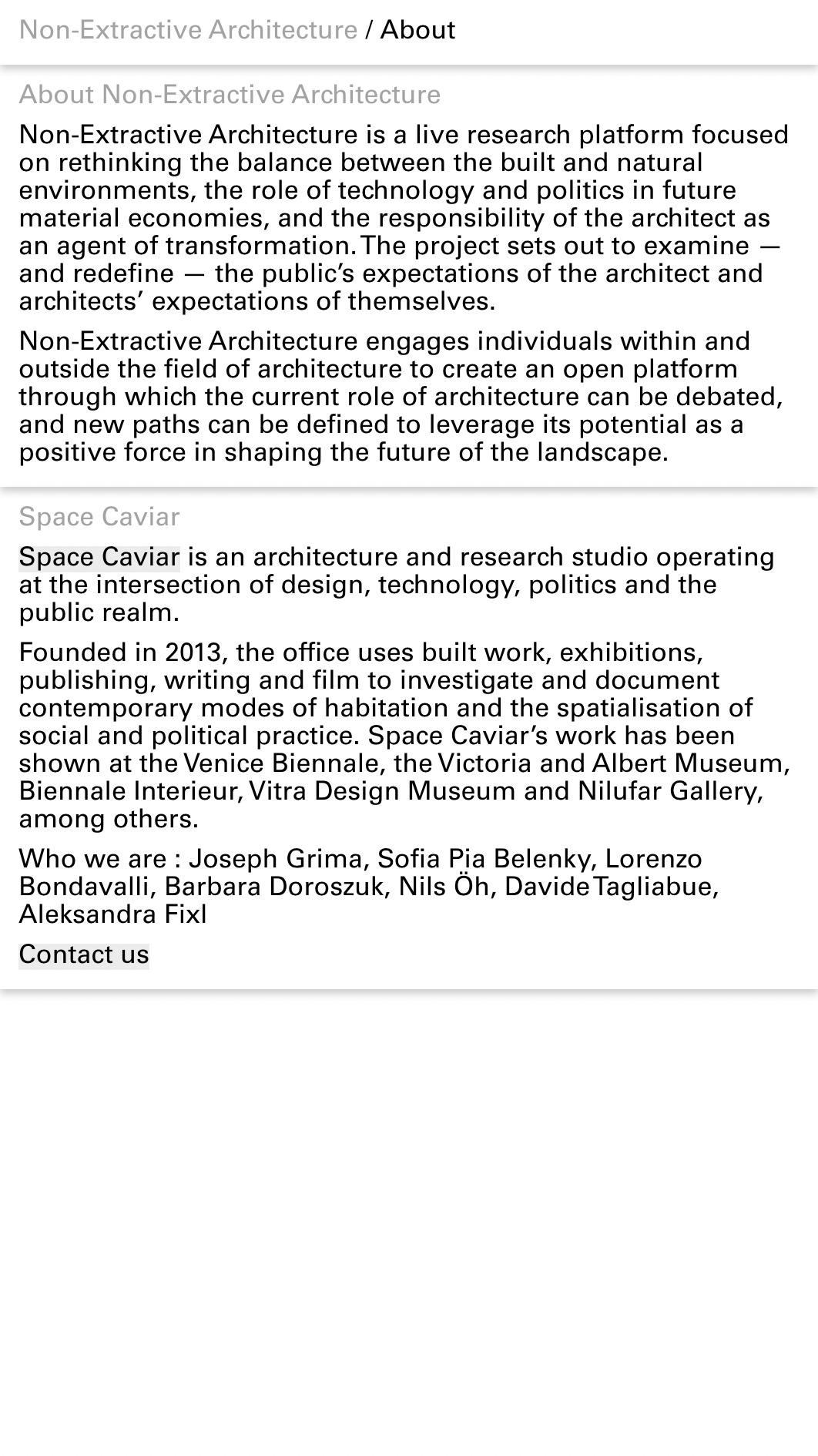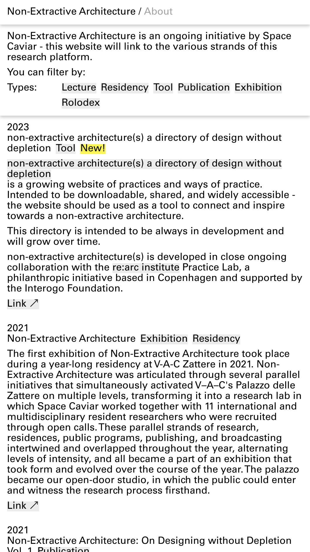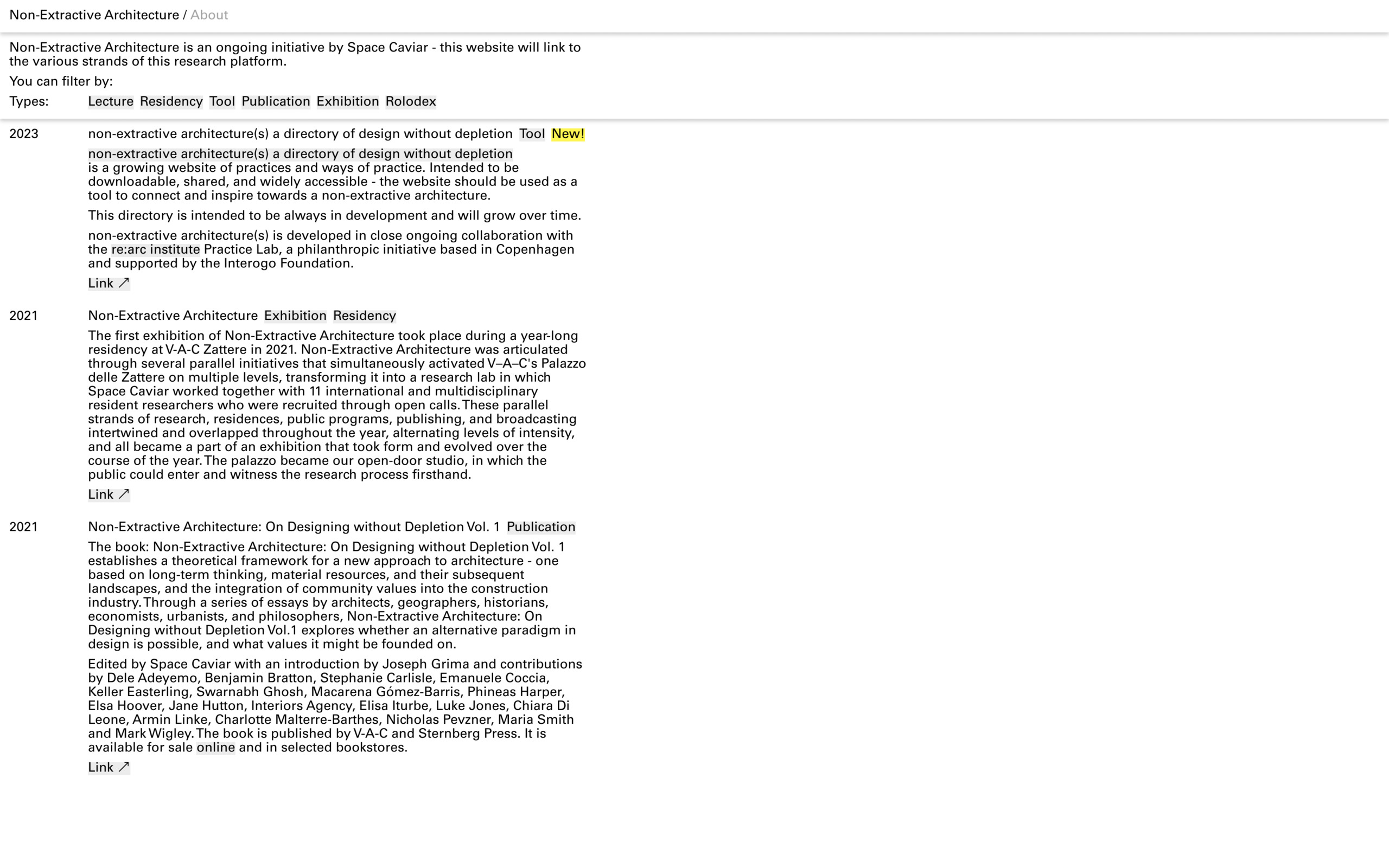 A mini-website serving as an index for the various iterations of the Non-Extractive Architecture project over the past years.
