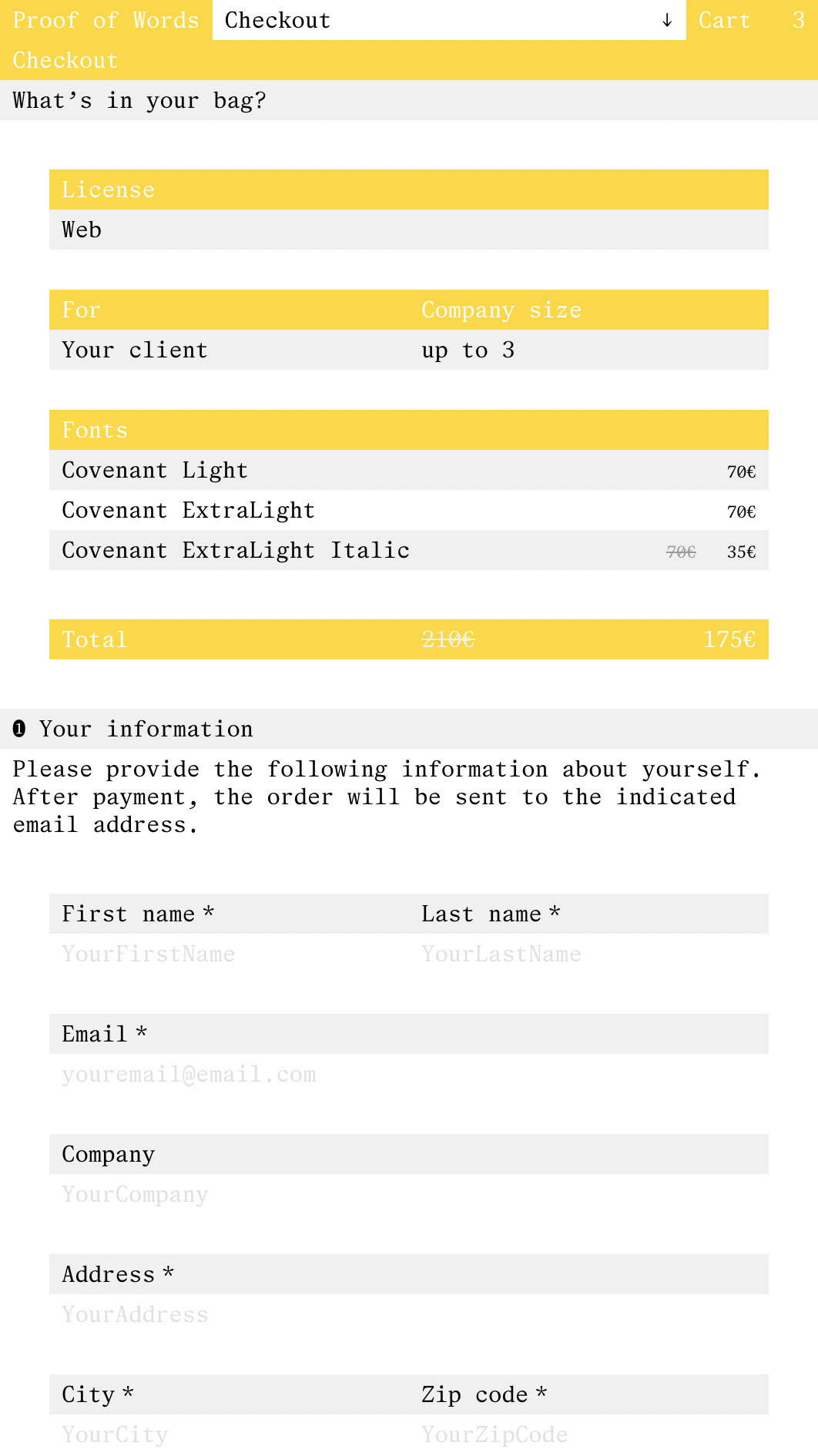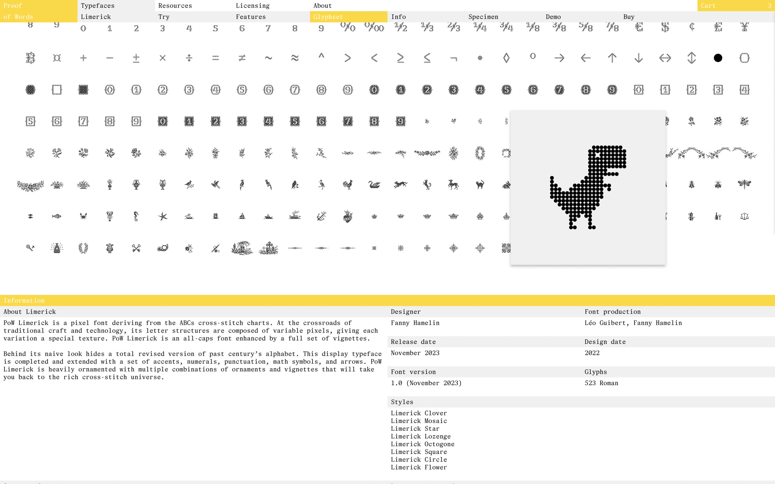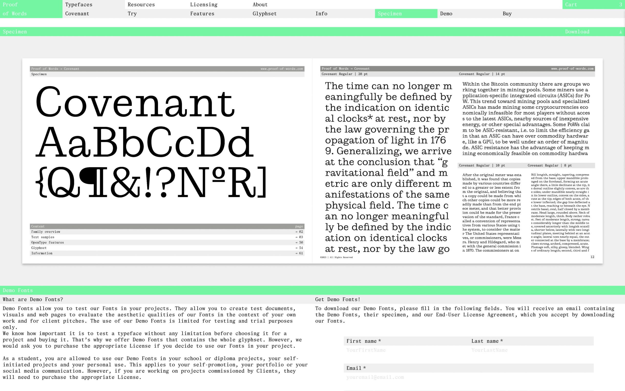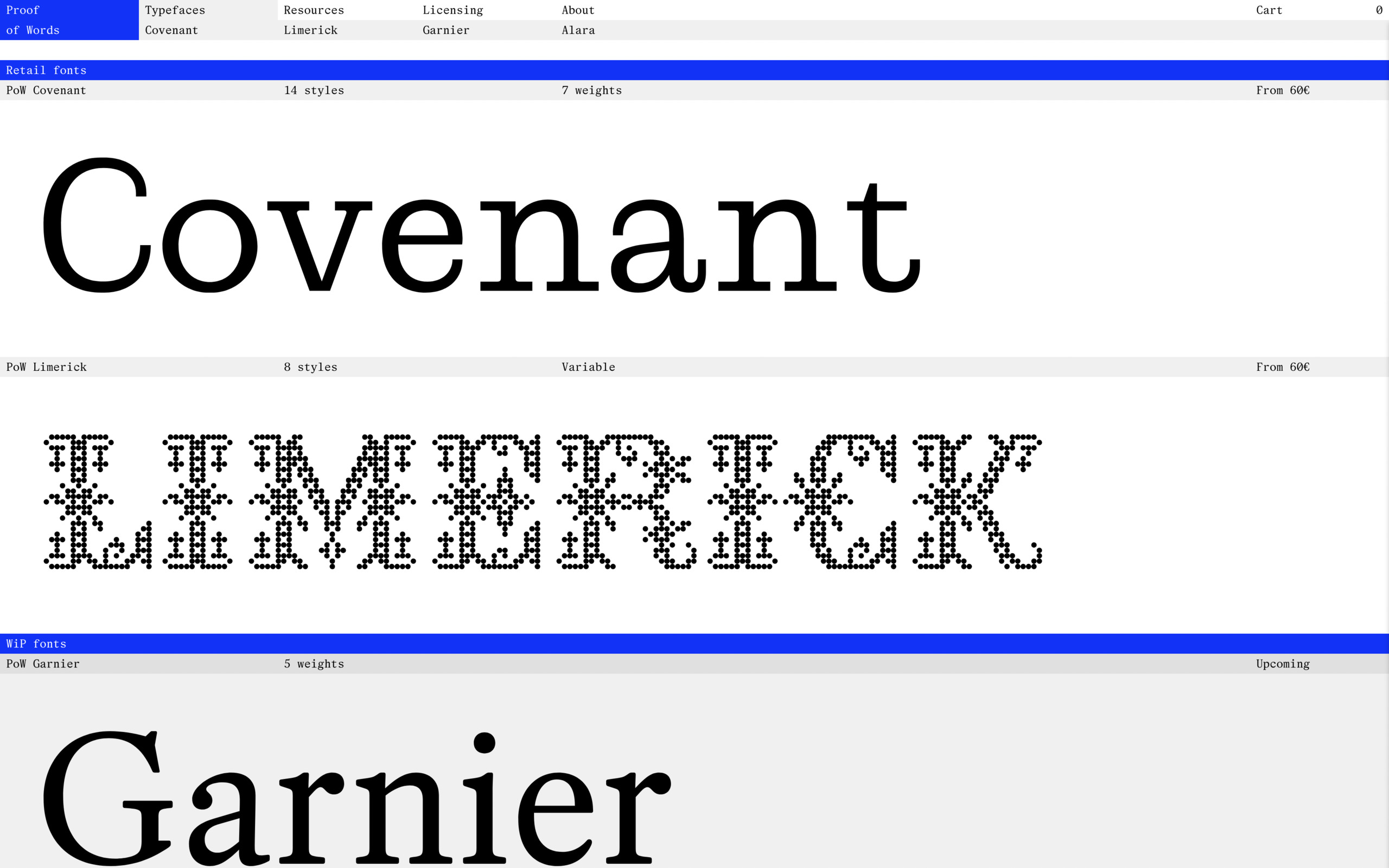 An online type foundry for Proof of Words, offering extensive type testing features, made-to-measure licensing methods, and comprehensive documentation for their growing collection of typefaces.